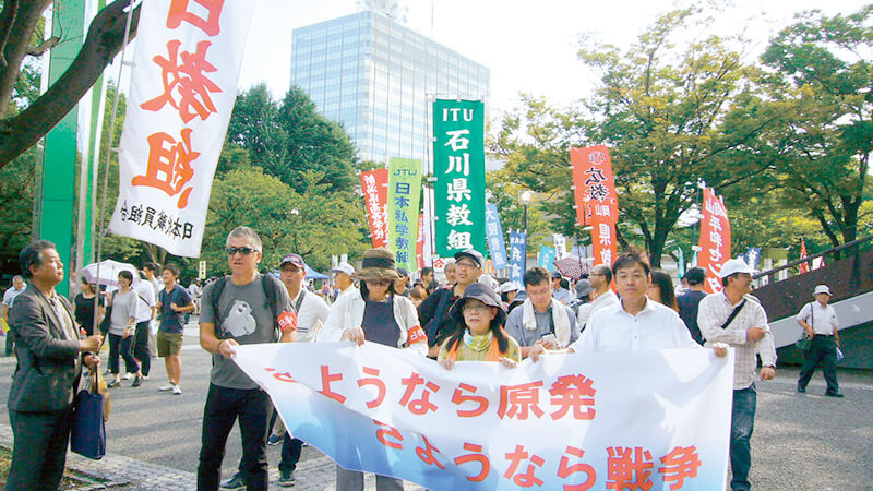 「教え子を再び戦場に送るな!」これは、日教組が1951年の中央委員会で採択したスローガンです。かつて教育が戦争を美化し、子どもたちを戦場に送り出し、その子どもたちの希望と未来をつみとってしまった悲しく、恐ろしい過去の反省からこのスローガンは生まれました。私たち大分高教組も、このスローガンのもと、平和教育を行っています。また、他団体と共闘し、平和を求め、世論に訴えるとりくみを行っています。